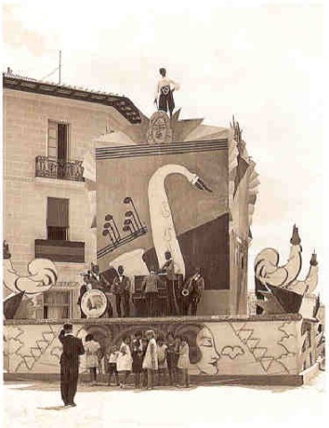 Monumento dedicado a la música. La parte frontal (visible en la foto) está dedicada al jazz, con una banda que toca en un típico garito. En la otra parte (oculta en la foto) se representa un tango argentino, con un cantor y un pianista. En uno de los laterales también hay 2 ninots de un empresario teatral y otro cineasta. Mientras que el primero se representa pobre y escuálido, el segundo está gordo y sujeta una bolsa de dinero, dando a entender que la implosión del cine se estaba cargando al teatro. En esa escena de fondo hay dibujadas varias imágenes, en una se ve un concierto de la Banda Municipal sin apenas público y al costado en la otra se representa la fachada de un cine cine con una larga cola de público esperando entrar y en otra empleados del Teatro Principal regalando caramelos en un intento desesperado por atraer espectadores.