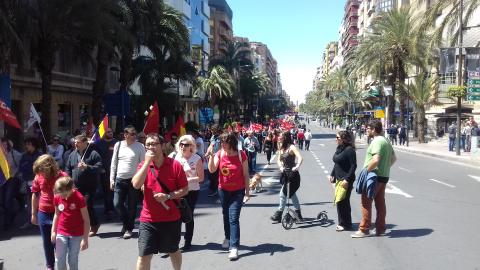 La marcha del Día Internacional de los Trabajadores comenzó en las escaleras del Instituto Jorge Juan y terminó en la Rambla. En la imagen, los manifestantes pasan por la avenida de Alfonso el Sabio.