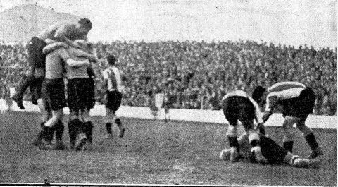 El encuentro entró entonces en una fase de dominio alterno en la que cualquier equipo podía marcar el gol de la victora. Hasta que en el minuto 70 Prat la puso en largo para Bosch, quien al primer toque se la cedió a Mandalúniz. Su remate bastante forzado parecía fácil para el portero Pérez, sin embargo el balón se le escapó cuando trataba de blocarlo. Estuvo rápido Edelmiro, quien entró rápidamente al choque propinándole un fuerte golpe al guardameta herculano y acabó marcando a placer. El cancerbero Pérez se quedó un tiempo en el suelo recuperándose del golpe (foto) mientras que los españolistas celebraban el gol.