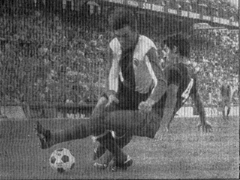En la imagen, el Cacho Saccardi es zancadillado por el defensa culé Antonio Olmo provocando el penalti que supuso el 1-0.
