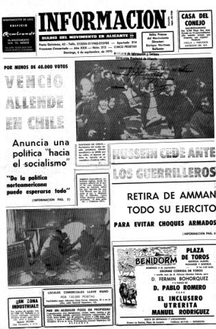 A pesar de que el candidato favorito del diario información en las elecciones para presidente de Chile era el conservador, con esta fecha anuncia la victoria del candidato socialista Salvador Allende, aunque intenta minimizarla apuntando que por una diferencia de solo 40.000 votos. Acompaña la noticia con una foto de manifestantes en la capital, Santiago de Chile, a favor del presidente electo. Tambien cita una palabras de éste, anunciado una política hacia el socialismo.
