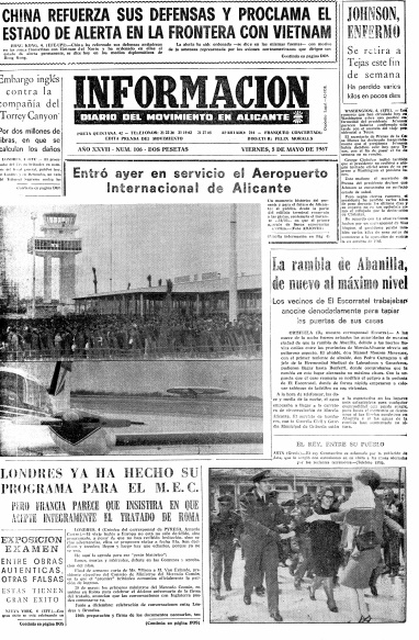"Entró ayer en servicio el Aeropuerto Internacional de Alicante", con este titular y una fotográfia de la torre de control se recoge en portada la noticia de la inaguración del Aeropuerto de El Altet, posiblemente una de las infraestructuras que más ha beneficiado a nuestra sociedad.