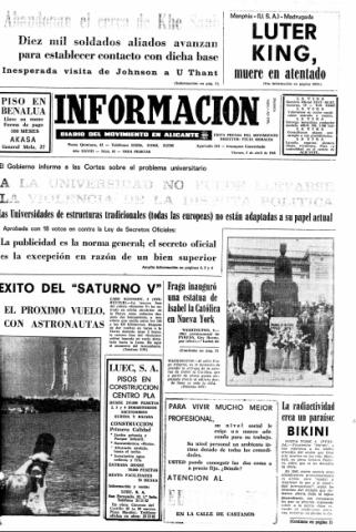 El diario información cuenta (solo el titular) en portada la muerte de Martin Luter King como fruto de un atentado ocurrido en Menphis de madrugada. Remite a más información en la pagina 2, donde da detalles del disparo recibido en la cabeza y en el hotel y quien es el sospechoso, acompañado de una foto del difunto.