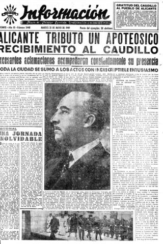 Toda la portada de este dia está dedicada a la visita de Francisco Franco a nuestra ciudad. La noticia se cuenta en 3 niveles distintos. El más importante, tanto por la extensión que ocupa como por la tipografía, se trata de ensalzar el "apoteósico recibimiento" de la ciudad al Caudillo. En otras palabras se resalta todo aquello que pueda suponer cariño de los alicantinos hacia el Jefe de Estado, compicidad con él, alegría, etc. Es decir Alicante es franquista como la que más. Todo ello presidido por una gran fotografia suya en el centro de la página.