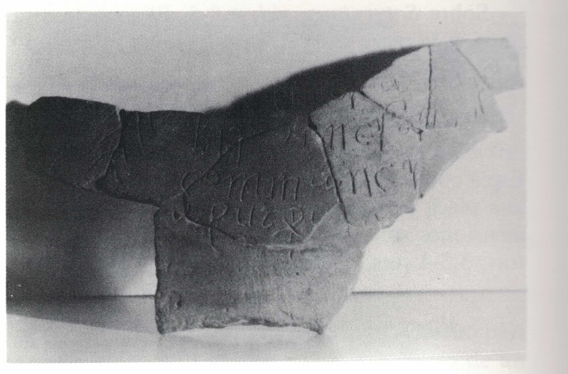 Hallada en la montaña de Fontcalent. Es un grafito sobre una cerámica tardoromana o visigoda.