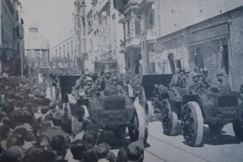 En esta foto los soldados están circulando por la Avenida Zorrilla, que poco después pasaría a llamarse Avenida José Antonio Primo de Rivera y actualmente se denomina Avenida de la Constitución.