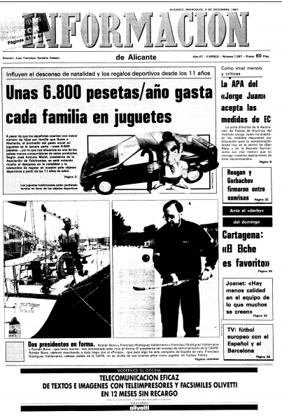 El 7 de Diciembre de 1987, Ronald Reagan y Mijail Gorvachov firmaron el tratado de no proliferación de armas nucleares en Estados Unidos que aún está vigente hoy en día. Nuestro poriódico recoge un simple titular en la portada "Raeagan y Gorvachov firmaron entre sonrisas" sin ninguna explicación y remitiendo a la página 32.