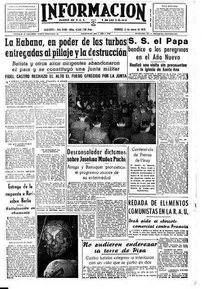 Nuestro alicantino diario informa sobre el abandono del dictador Batista y otros personas miembros o altos cargos de su gobierno y algunos de sus familiares, de Cuba, principalmente con destino a EEUU y la República Dominicana. También da cuenta de que en la ciudad de La Habana se están produciendo disturbios y pillajes callejeros. Una junta militar se ha hecho cargo del gobierno. Fidel Castro no reconoce autoridad alguna a dicha junta.
