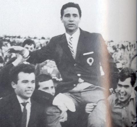 El entrenador Luis Belló a hombros tras el ascenso (1966)