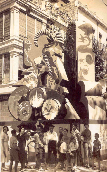 Sobre una base cuadrada se levanta una extraña figura con cuernos. A su costado vemos al nintor de un hombre, posiblemente el presidente de la comisión José Navarro Úbeda, solicitando dinero para la hoguera. A sus pies vemos una serie de círculos que representan al comercio, la industria y el vecindario del barrio; quienes rechazan dar dinero.