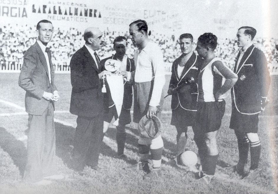 En la imagen, Ricardo Zamora (capitán del Real Madrid) recibe un banderín regalo de la peña herculana Los Gorilas entregado por su presidente Ángel Aznar en compañía del capitán herculano Manolo Macià (vestido de traje pues no jugó el partido). Aquel día ejerció de capitán Ramonzuelo, quien también está presente en la foto presenciando la escena junto a los árbitros.